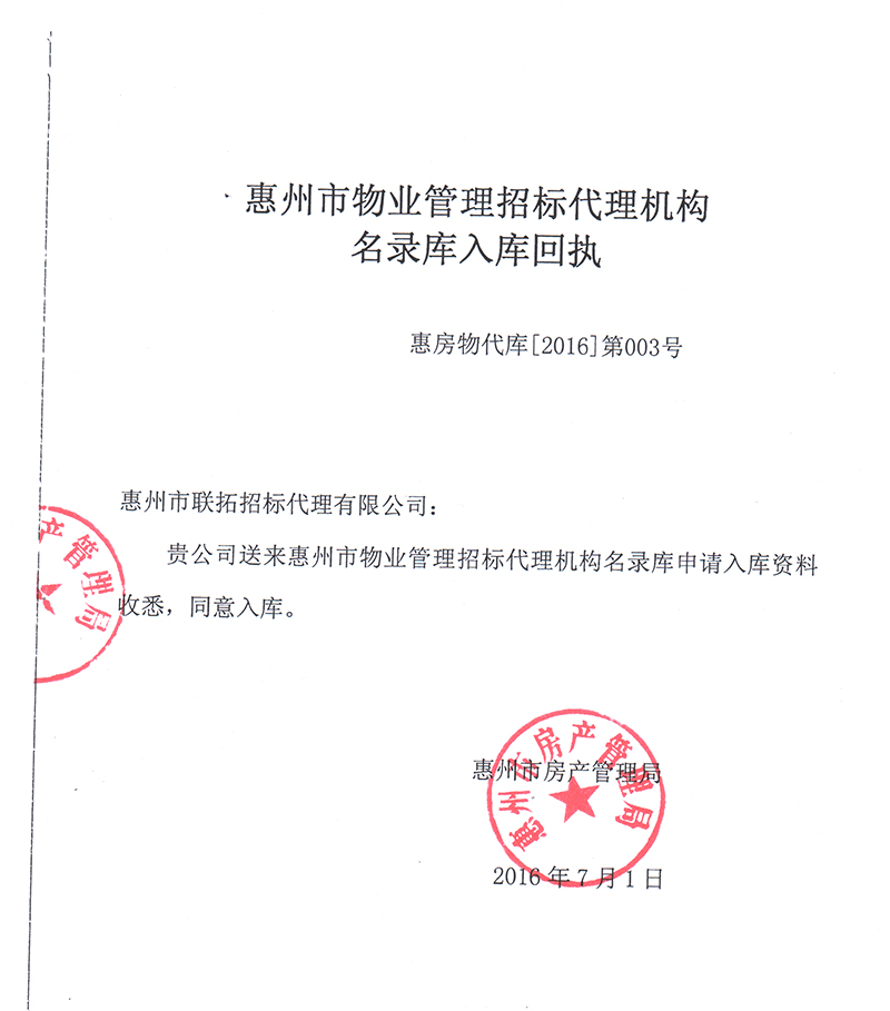 招標(biāo)代理機(jī)構(gòu)房產(chǎn)入庫回執(zhí)